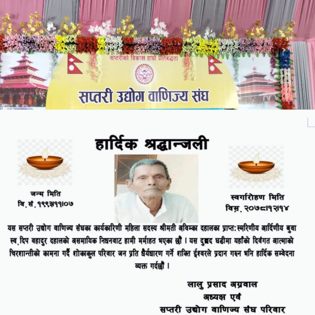 नेपाल पत्रकार महासंघ सप्तरी शाखा उपाध्यक्ष तथा उधोग वाणिज्य संघ सप्तरी राजबिराजका कार्यकारिणी महिला सदस्य अम्बिका दहाललाई पितृ शोक परेको छ ।