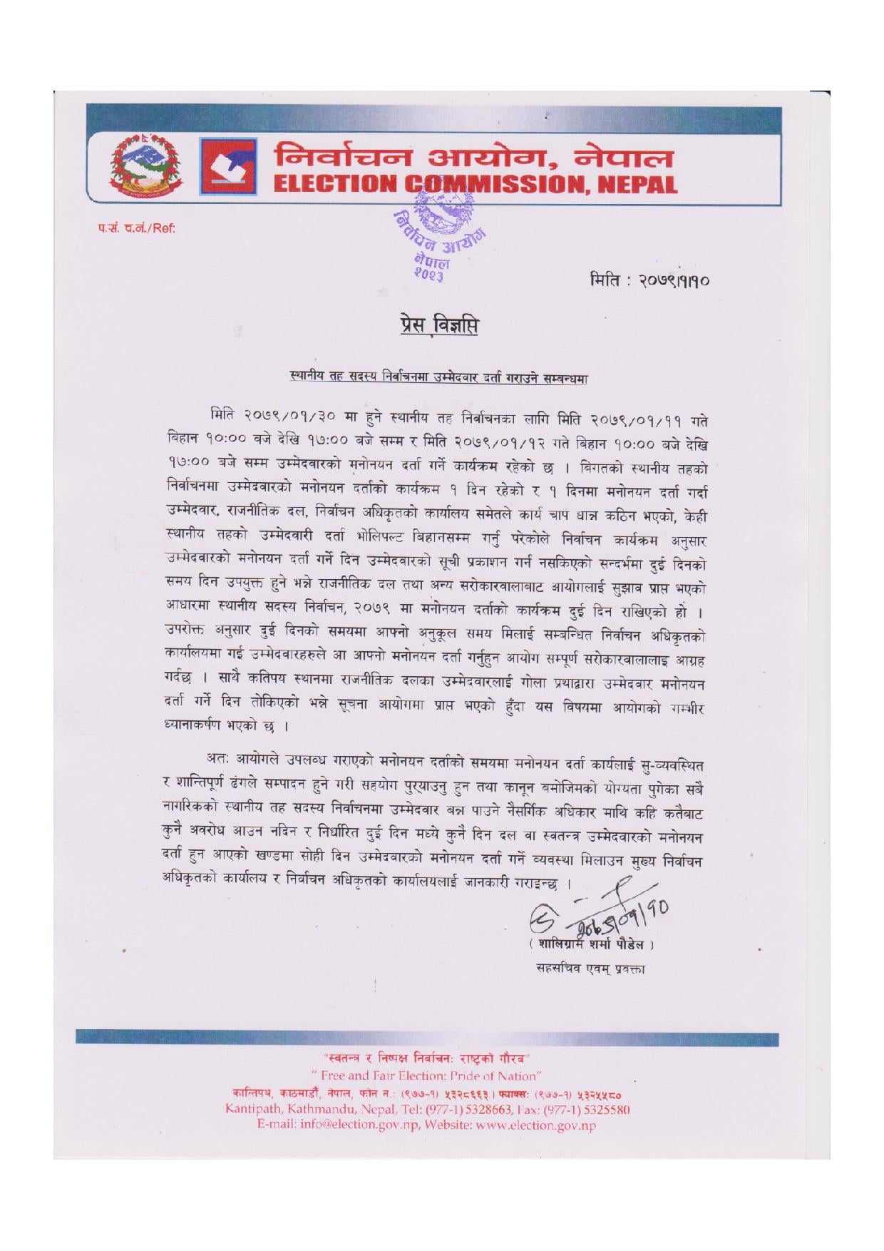 आयोगका प्रवक्ता शालिग्राम शर्मा पौडेलले शनिबार जारी गरेको विज्ञप्तिमा उम्मेदवारी दर्ताका लागि दुई दिन समय दिइएको उल्लेख छ।
