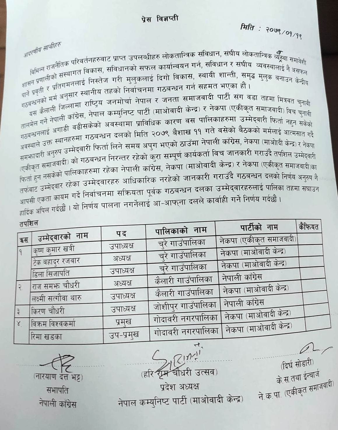 स्थानीय तहको निर्वाचनका लागि तीन दलीय गठबन्धनका नेपाली कांग्रेस, नेकपा माओवादी केन्द्र र एकीकृत समाजवादीले धनगढीमा पत्रकार सम्मेलन गर्दै संयुक्त रुपमा बागी उम्मेदवारी दिनेहरुमाथि कार्बाही गर्ने निर्णय गरिएको जनाएको हो।
