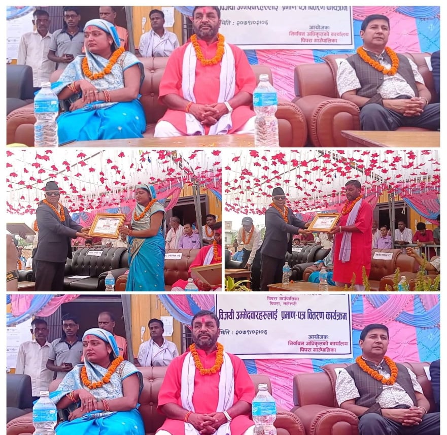 महोत्तरी :  महोत्तरी जिल्लाको   पिपरा गाउँपालिकाको  नवनिर्वाचित  जनप्रतिनिधिहरुलाई शनिबार प्रमाणपत्र बितरण गरिएको छ।
