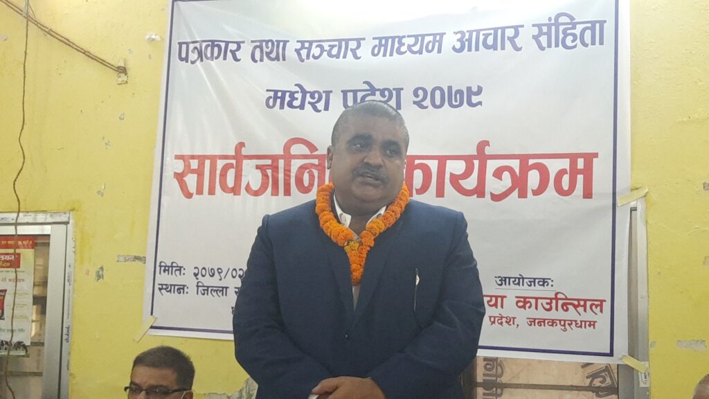 मधेस प्रदेश मिडिया काउन्सिलले तयार पारेको पत्रकार तथा सञ्चारमाध्यम आचारसंहिता मधेस प्रदेश २०७९ को आज जनकपुरधाममा सार्वजनिक गर्नुहुँदै मन्त्री साहले प्रदेश सरकार प्रेस स्वतन्त्रता र नागरिकता स्वतन्त्रताप्रति प्रतिबद्ध रहेको बताउनुभयो ।