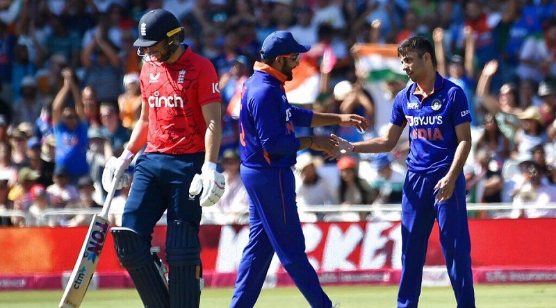 भारतका हर्सल पटेल र रवि विश्नोईले २/२ तथा अभेस खान र उम्रन मलिकले एक/एक विकेट लिए । गएरातिको खेलमा विजयी भए पनि इङ्ल्यान्डले तीन खेलको टी–२० श्रृङ्खला २–१ ले गुमाएको छ