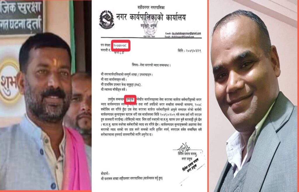 शहिदनगर नगरपालिकामा करार सेवामा कार्यरत कर्मचारीहरुलाई कार्य सम्पादन र मूल्याँकनको आधारमा पुन अवधी थप गर्ने गरी कार्य सम्पादनको प्रतिवेदन बुझाउन जारी गरिएको सूचनामा चालु आर्थिक बर्ष २०७८÷०७९ हुनुपर्नेमा २०७७÷०७८ नै राखेपछि पत्रको अर्थ उल्टीएको थियो ।