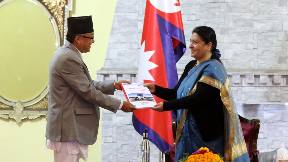 राष्ट्रपति विद्यादेवी भण्डारीलाई बिहीबार प्रतिनिधिसभा निर्वाचन परिणाम प्रतिवेदन हस्तान्तरण गर्दै प्रमुख निर्वाचन आयुक्त दिनेश थपलिया ।