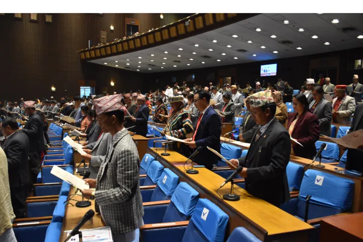 यसअघि प्रतिनिधिसभाका ज्येष्ठ सदस्य पशुपतिशम्शेर जबराले नवनिर्वाचित सांसदहरूलाई पद तथा गोपनीयताको शपथ गराउनुभएको थियो । नेपालको संविधानको धारा ८८ बमोजिम सङ्घीय संसद्को प्रत्येक सदनका सदस्यले सदन वा त्यसको कुनै समितिको बैठकमा पहिलोपटक भाग लिनुअघि सङ्घीय कानुनबमोजिम शपथ लिनुपर्ने व्यवस्था छ ।