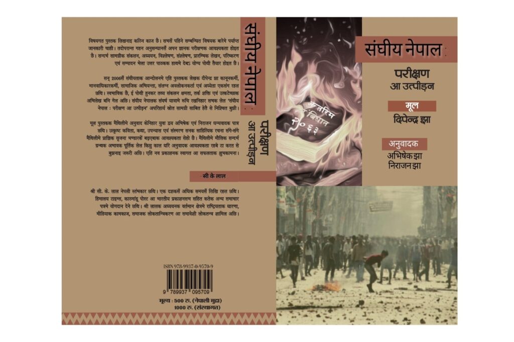जनकपुरधाम । दीपेन्द्र झाद्वारा अंग्रेजी भाषामा लिखित ‘फेडरल नेपाल ट्रायल्स एण्ड ट्रिब्युसन’को मैथिली अनुवाद संघीय नेपाल परीक्षण र उत्पीडन नामक पुस्तक सार्वजनिक भएको छ ।