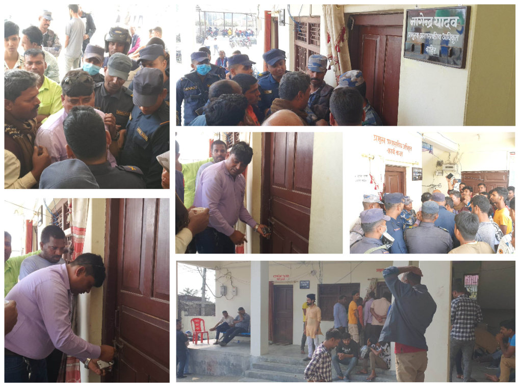 वडा नम्बर–१ का वडाध्यक्ष दिलिप यादव, वडा नम्बर–५ का वडाध्यक्ष दुखरण यादव, वडा नम्बर–६ का वडाध्यक्ष महाविर साह र वडा नम्बर–७ का वडाध्यक्ष गंगा साहलगायतकाहरूले आइतबार प्रमुख प्रशासकिय अधिकृतको कार्यकक्ष र लेखाशाखामा पुनः तालाबन्दी गरेका छन् ।
