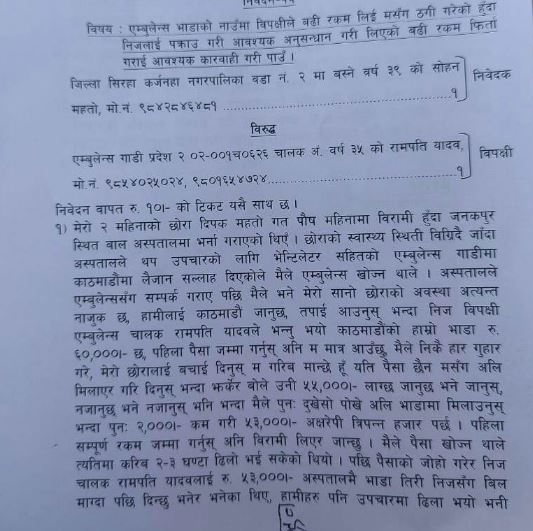 सिरहाको कर्जनहा नगरपालिका वडा नम्बर–२ बस्ने सोहन महतोले प्र.२–०२–००१–०६२६ नम्बरको एम्बुलेन्स गाडीका चालक ३५ वर्षीय रामपति यादवविरुद्ध उजुरी दिएका हुन् ।