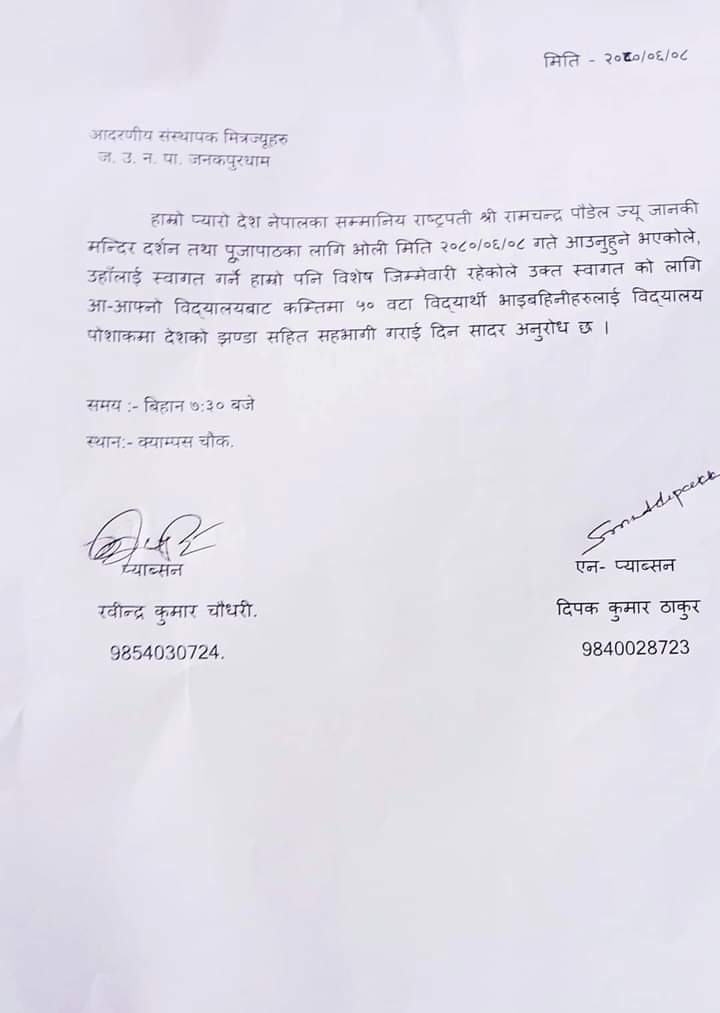 जनकपुरधाम । महामहिम राष्ट्रपति राम चन्द्र पौडेलको सवारी भोली जनपुरधाममा हुनु गौरबको कुरा हो। वहाको स्वागत पनि धुमधामका साथ हुनुपर्छ।