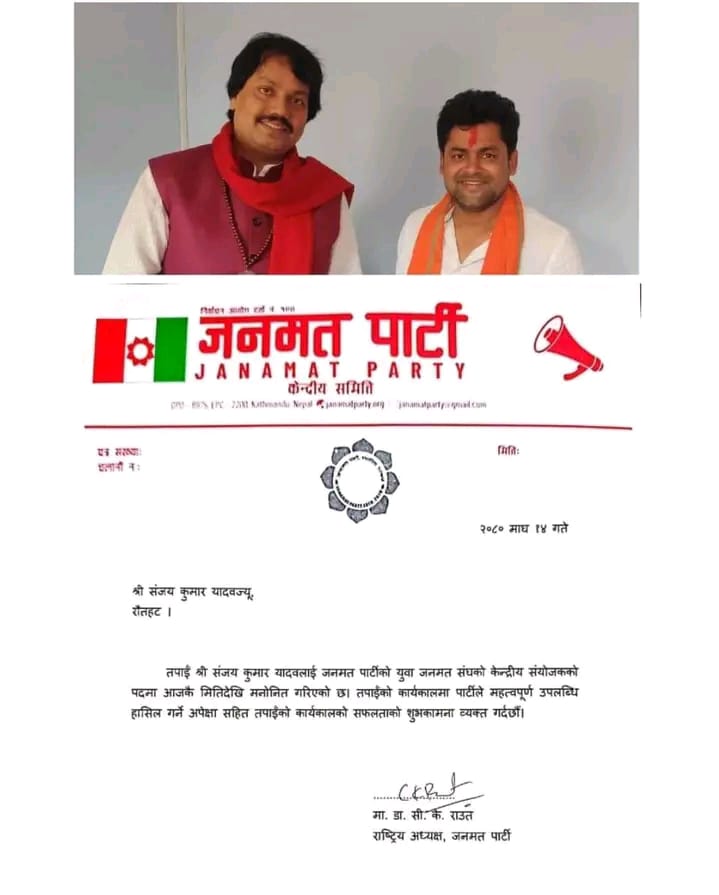 जनकपुर । जनमत पार्टीको भातृ संगठन युवा जनमत संघको केन्द्रीय संयोजकमा संजय कुमार यादव चयन भएका छन ।