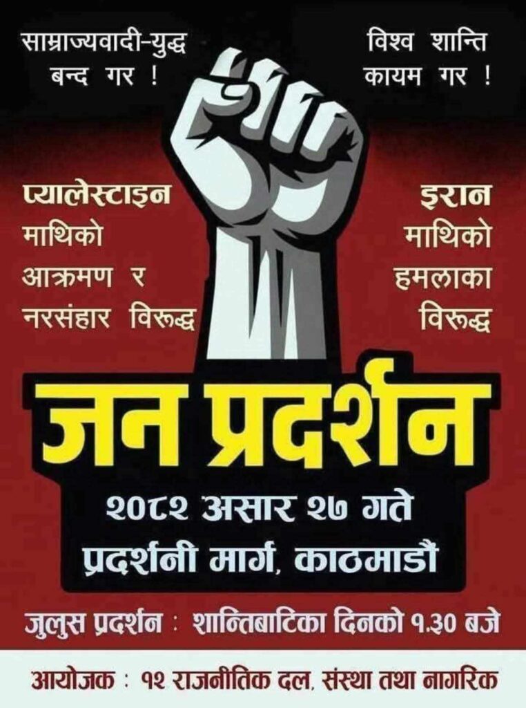 इजरायली हमलामा झन्डै ५५ हजार निर्दोष प्यालेस्टाइनीको हत्या भए पछि नेपालका बामपन्थी दलहरू प्रदर्शनमा उत्रिन लागेका हुन् । संसद बाहिर रहेका नेत्रबिक्रम चन्द नेतृत्वको नेकपा, मोहन बैध नेतृत्व पनि सो प्रदर्शनमा उत्रिने छन् ।