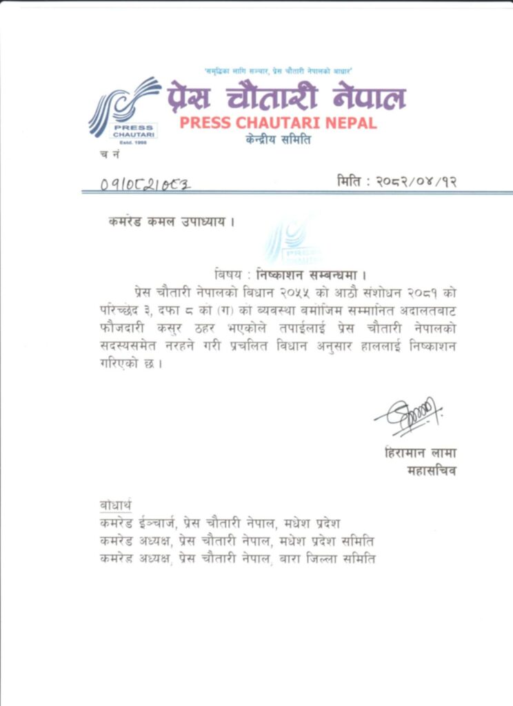 प्रेस चौतारी नेपालका महासचिव हिरामान लामाले विज्ञप्ति जारी गर्दै उपाध्यायको साधारण सदस्यता समेत नरहने गरी निष्काशन गरिएको जानकारी दिएका हुन्।